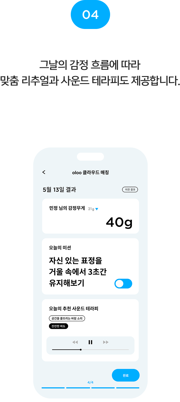 울루 감정 클라우드 매칭은 감정을 말로 설명하지 않고, 화면 속 떠다니는 구름 중 지금 마음에 가까운 것을 고르는 방식으로 진행됩니다. 선택한 감정은 무게로 환산되어 구름 오브젝트의 위치로 표현되며, 오늘의 내면이 얼마나 가볍거나 무거운지 직관적으로 확인할 수 있습니다.